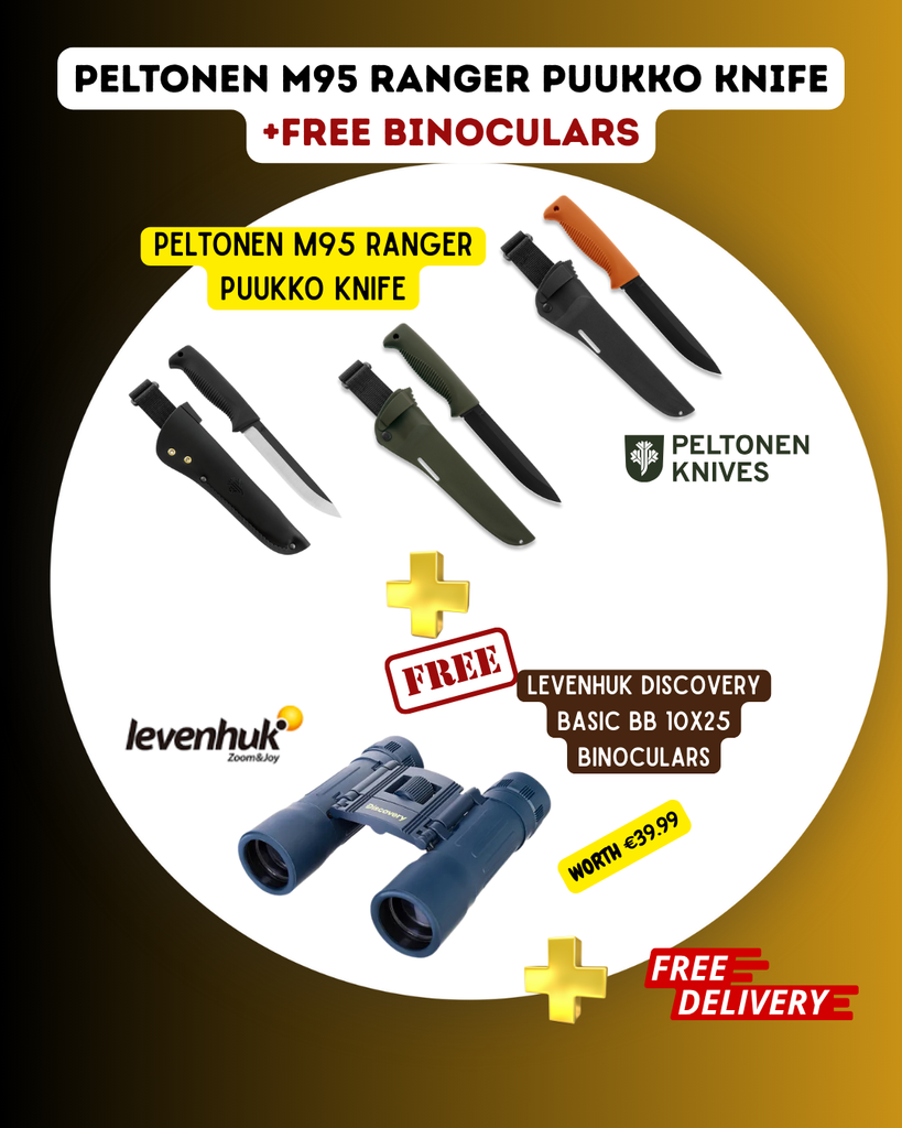 Special Offer - FREE pair of Levenhuk Discovery Basis BB 10x25 Binoculars (worth €39.99) with every Peltonen Hunting Knife sold!