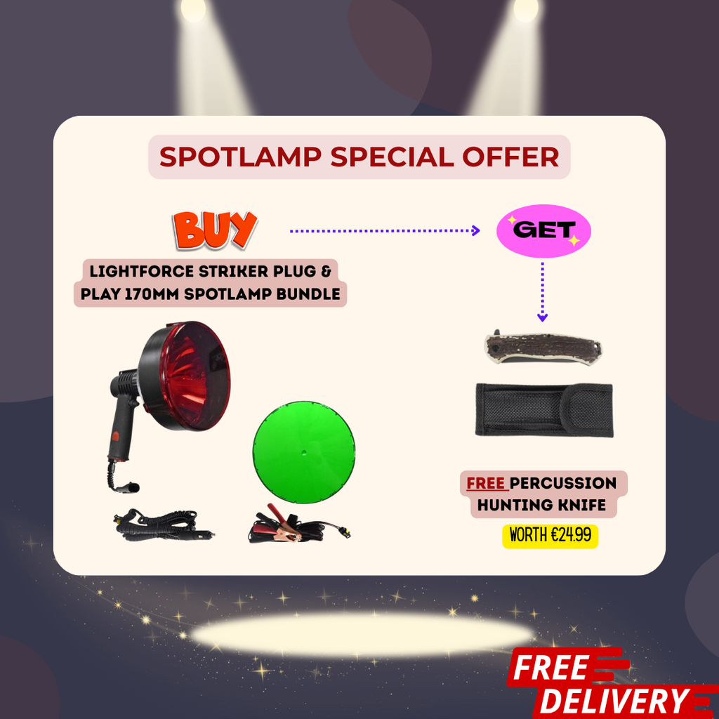 Kevin says: "For a limited period, we are giving away a FREE Percussion Folding Hunting Knife (worth €24.99) with every Lightforce Striker Spotlamp sold. Oh, and FREE Delivery too!"