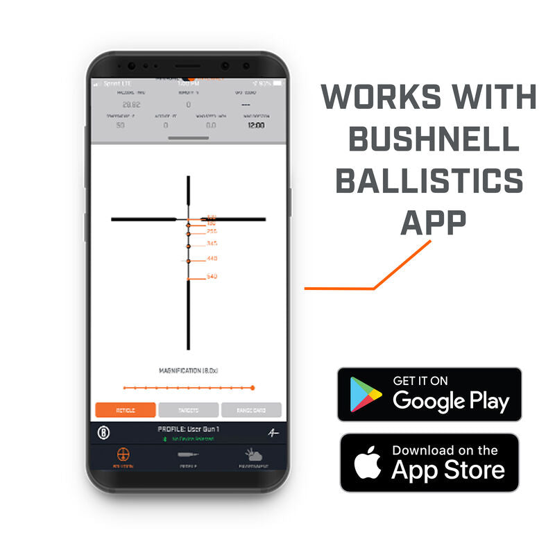 - With the free Bushnell Ballistics App you can quickly determine your exact distances on the reticle making it easy to have confidence in every shot.