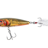 - The popper features internal rattles and a feathered tail hook, for additional interest and attractiveness in the water.